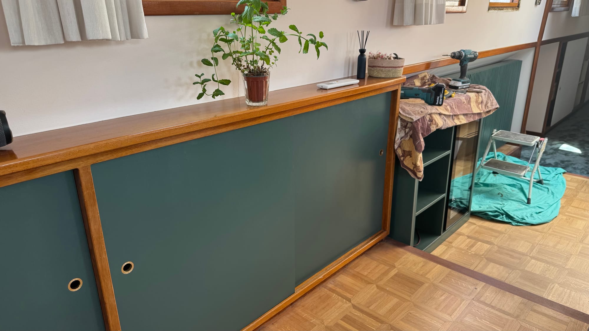 We'd had a lot of debate about the sliding cupboard doors and what colour to paint them. We were leaning towards pink, but everyone else suggested doing them the same green as the cabinets in the salon. We decided to bite the bullet and make that happen, and Karina spent some time prepping and painting those. Wow! What a difference. With the new brass handles inserted, they are quite spec'y now.