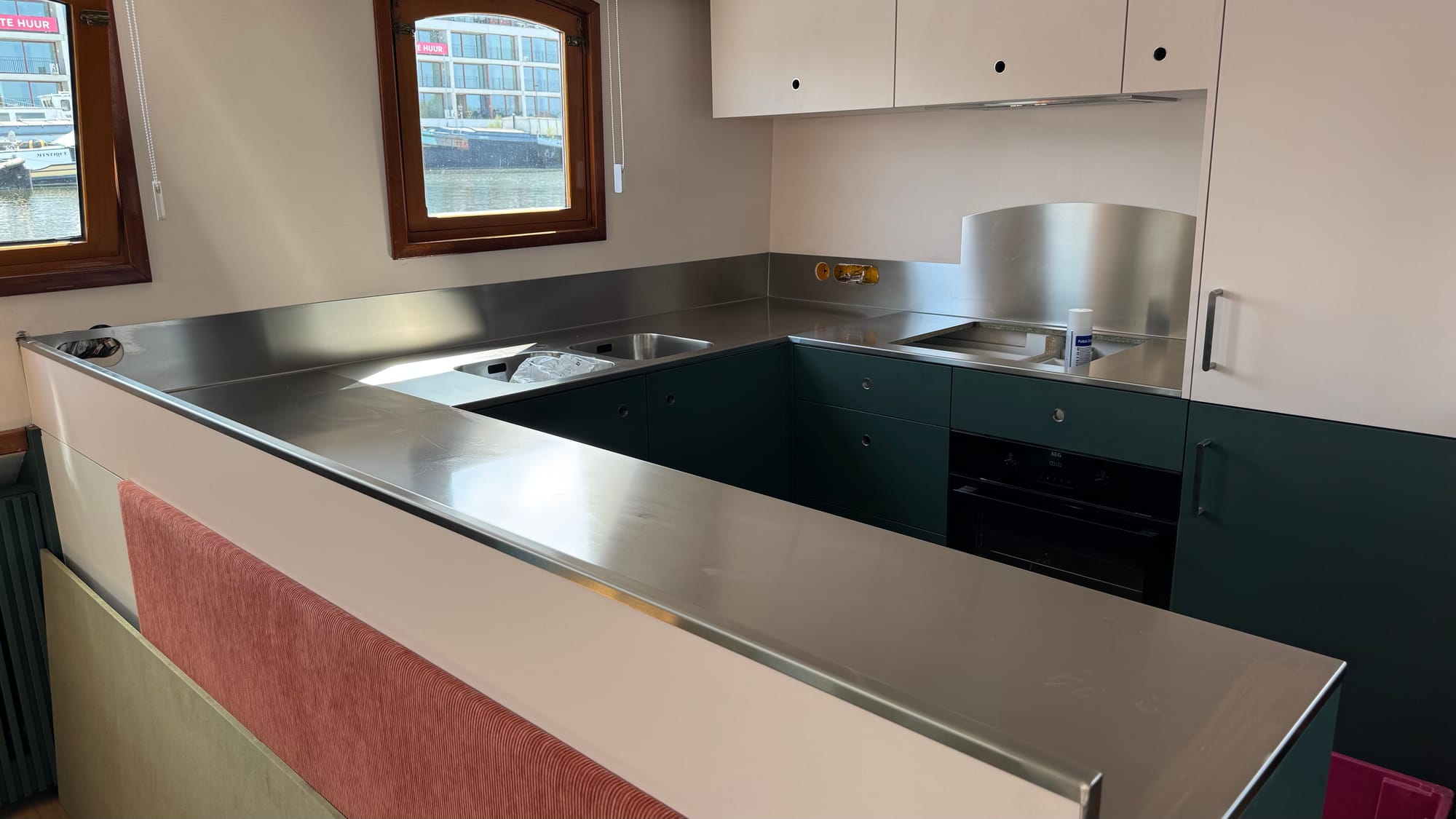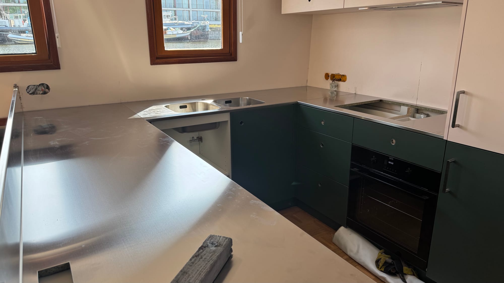 The stainless steel arrived on Thursday for the kitchen countertops. Overall, it looks great, but there are a couple of minor adjustments and follow-ups that need to be made. The seams were intended to be welded on-site, but this didn't happen.