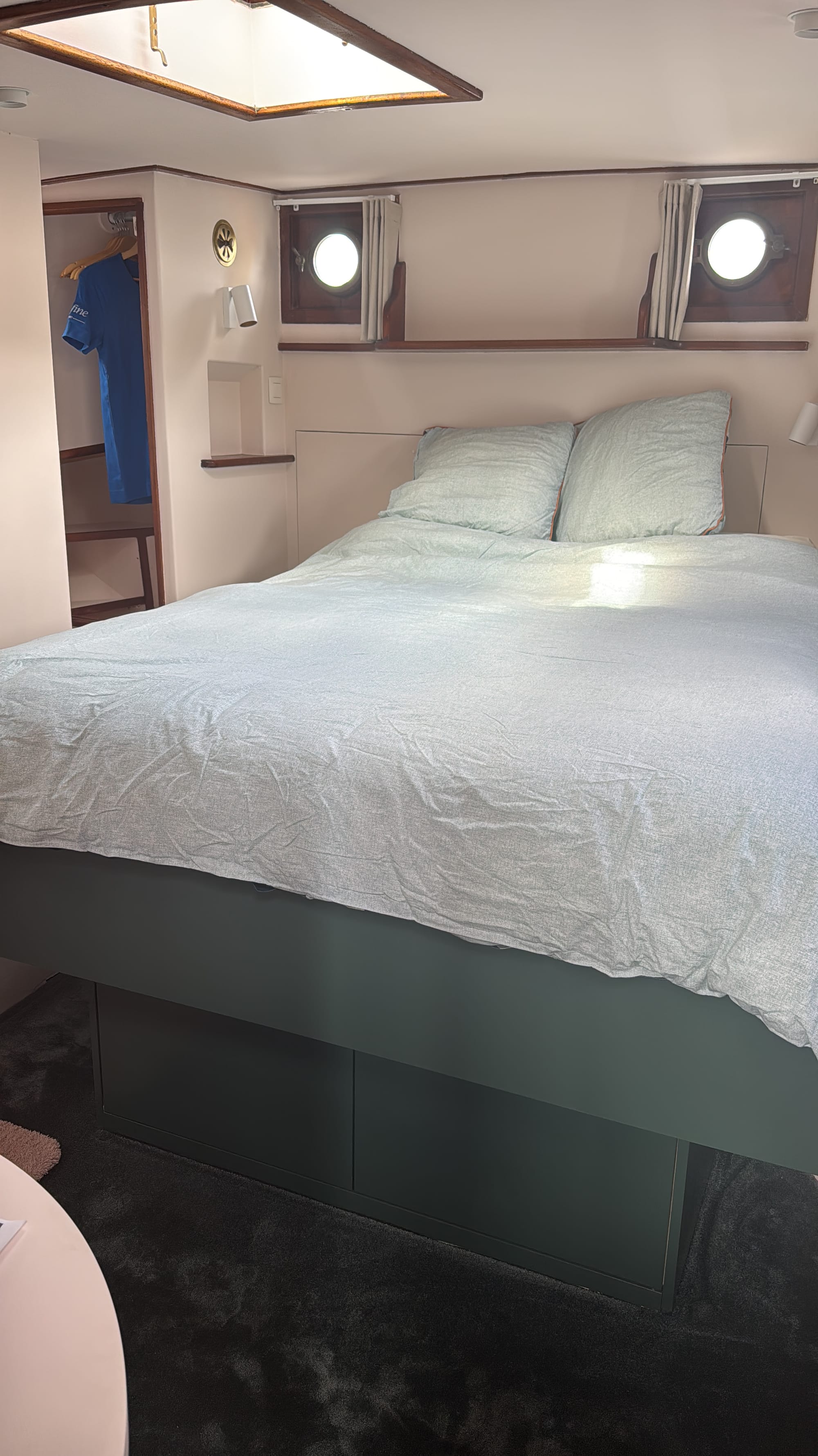 What's left to do? Well, the door for the bathroom needs to go in – that's possibly still months away, and then after that, we need to fit decorative trim around the door and walls. All of that is a problem for future Tim & Karina, though. If we had guests tomorrow, we could live very comfortably in the stern cabin now. Given that it's not a guest accessible area, the door and trim can wait.