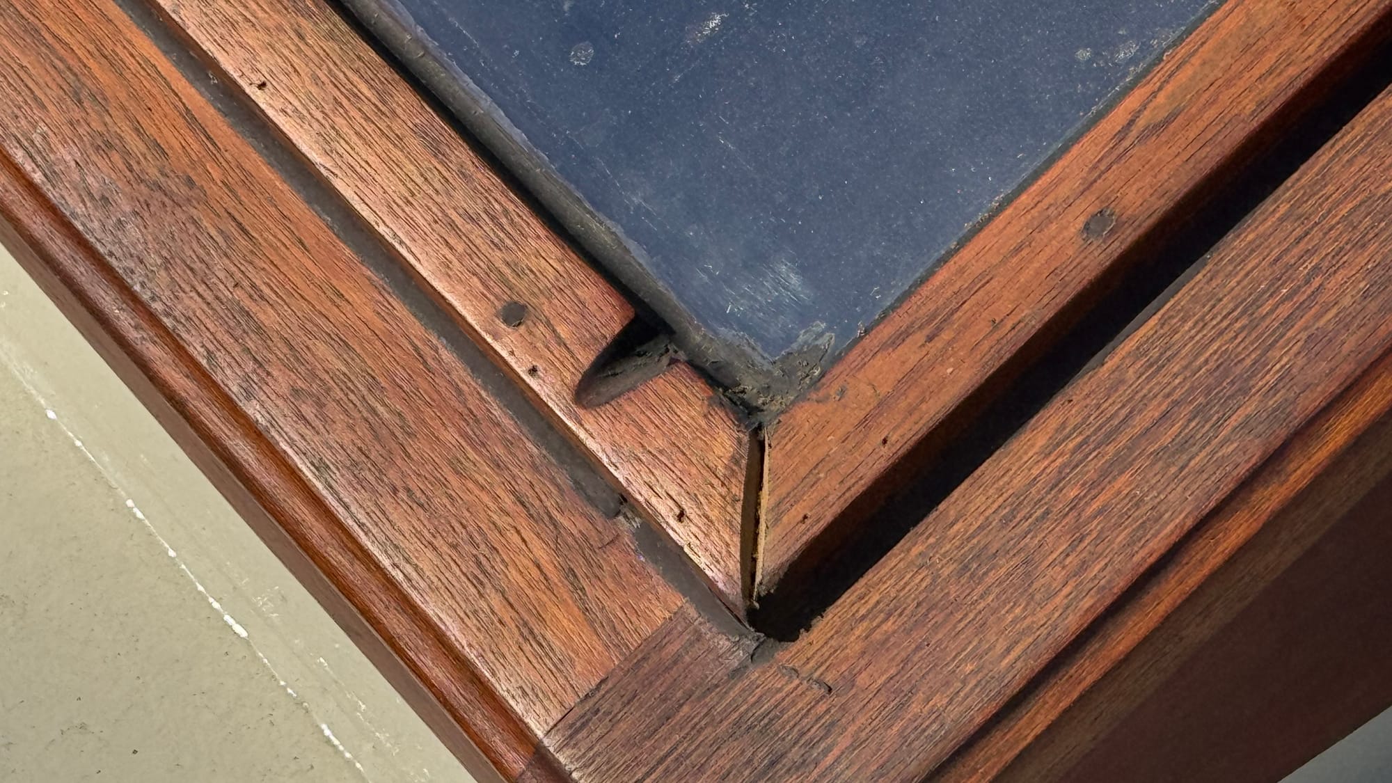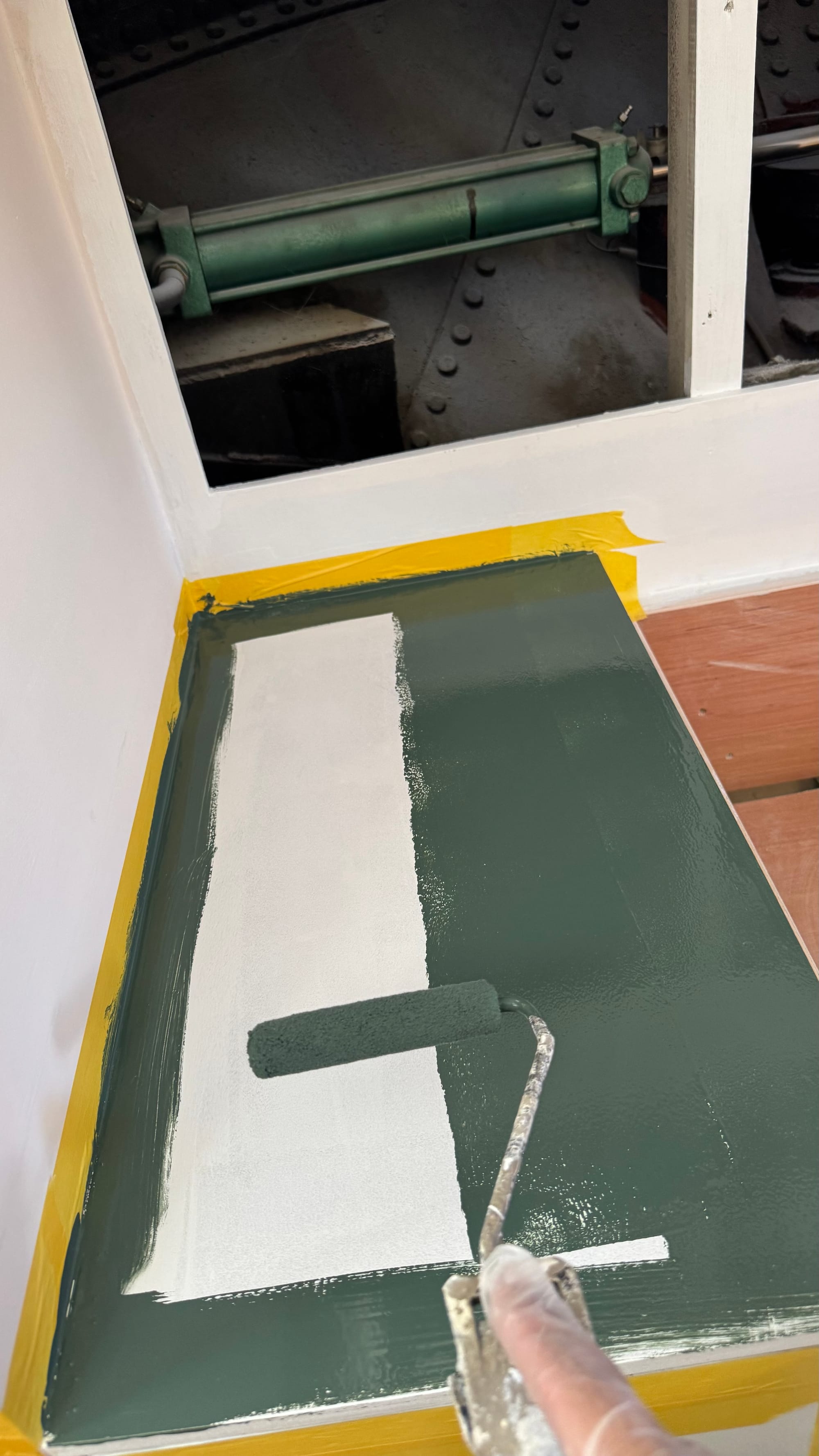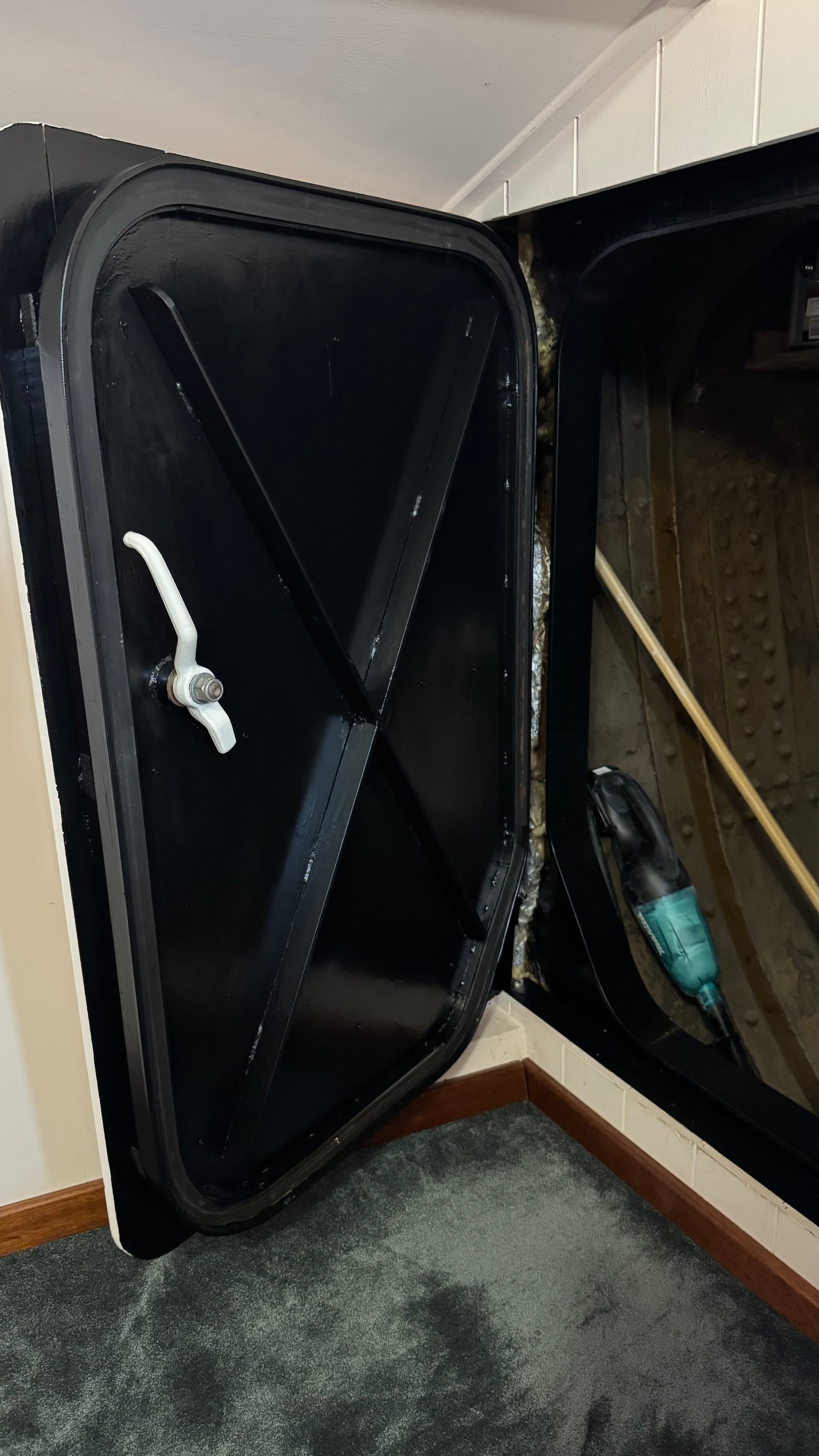 Lots of small progress too. Hole under the stairs all patched (again). Fire extinguishers re-certified. Routed out the joins on the dog hatch and re-siliconed them. The finished forepeak hatch door.