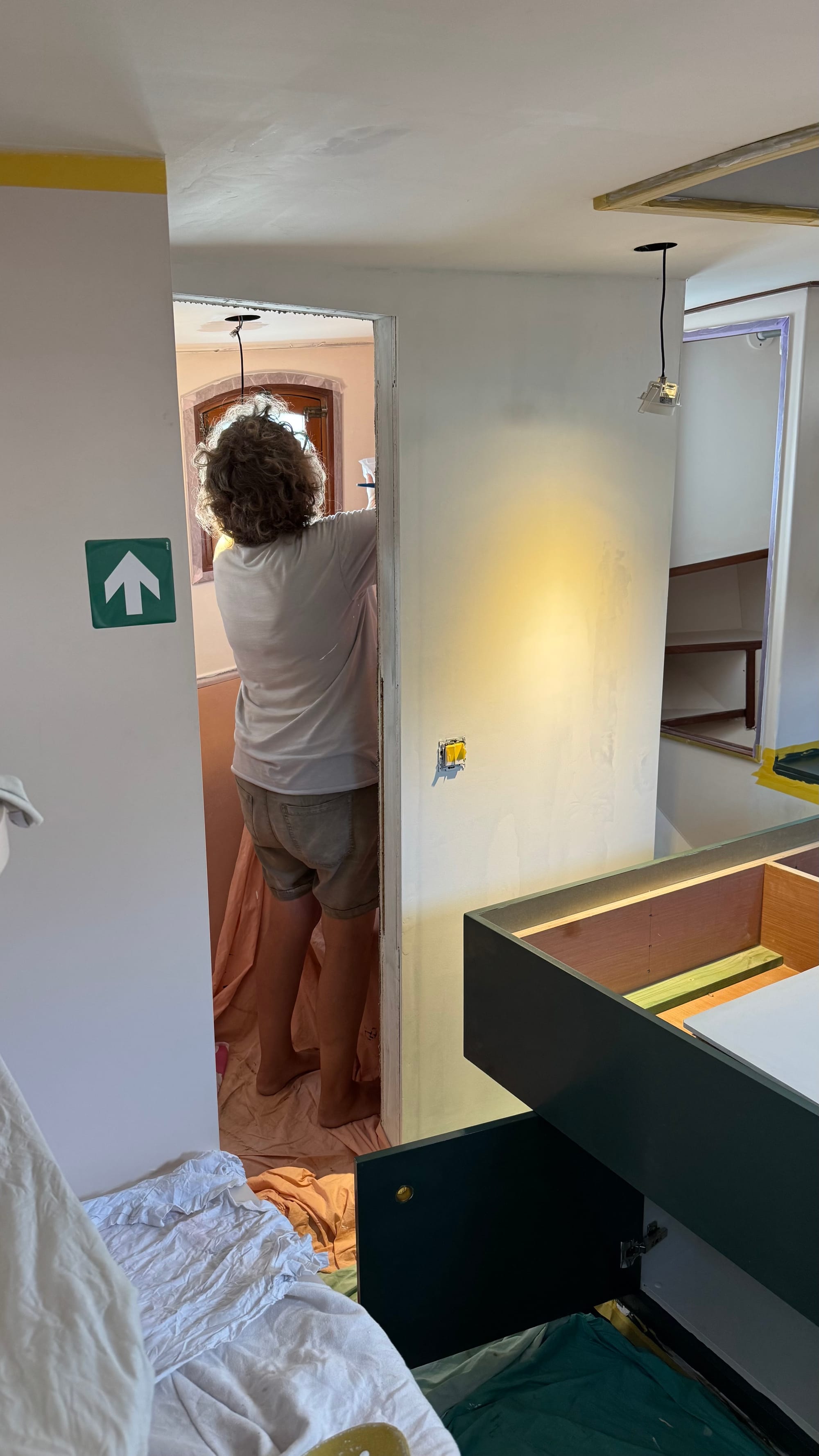 It's been a monotonous couple of weeks. Filling, patching, sanding, and repeating forever to repair all the holes and damage left by the building process, moving walls, and moving lights. The stern cabin has the most angles, the most original woodwork, requires the most taping, and is also the most difficult to access to paint. It's been a pain!